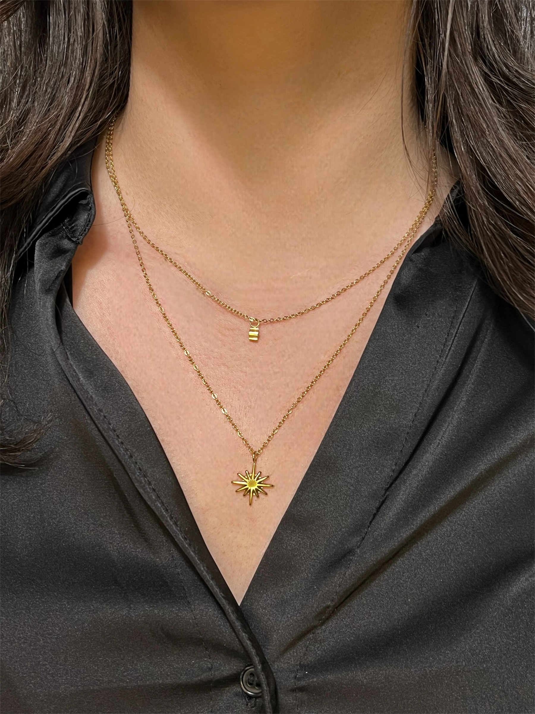 Lys upp din stil med Celestial Glow Halsband – en elegant, lager-på-lager-design med en gnistrande zirkon och en strålande stjärnhänge. Perfekt för att addera en touch av glamour och mystik till din look, vare sig det är till vardags eller vid speciella tillfällen.