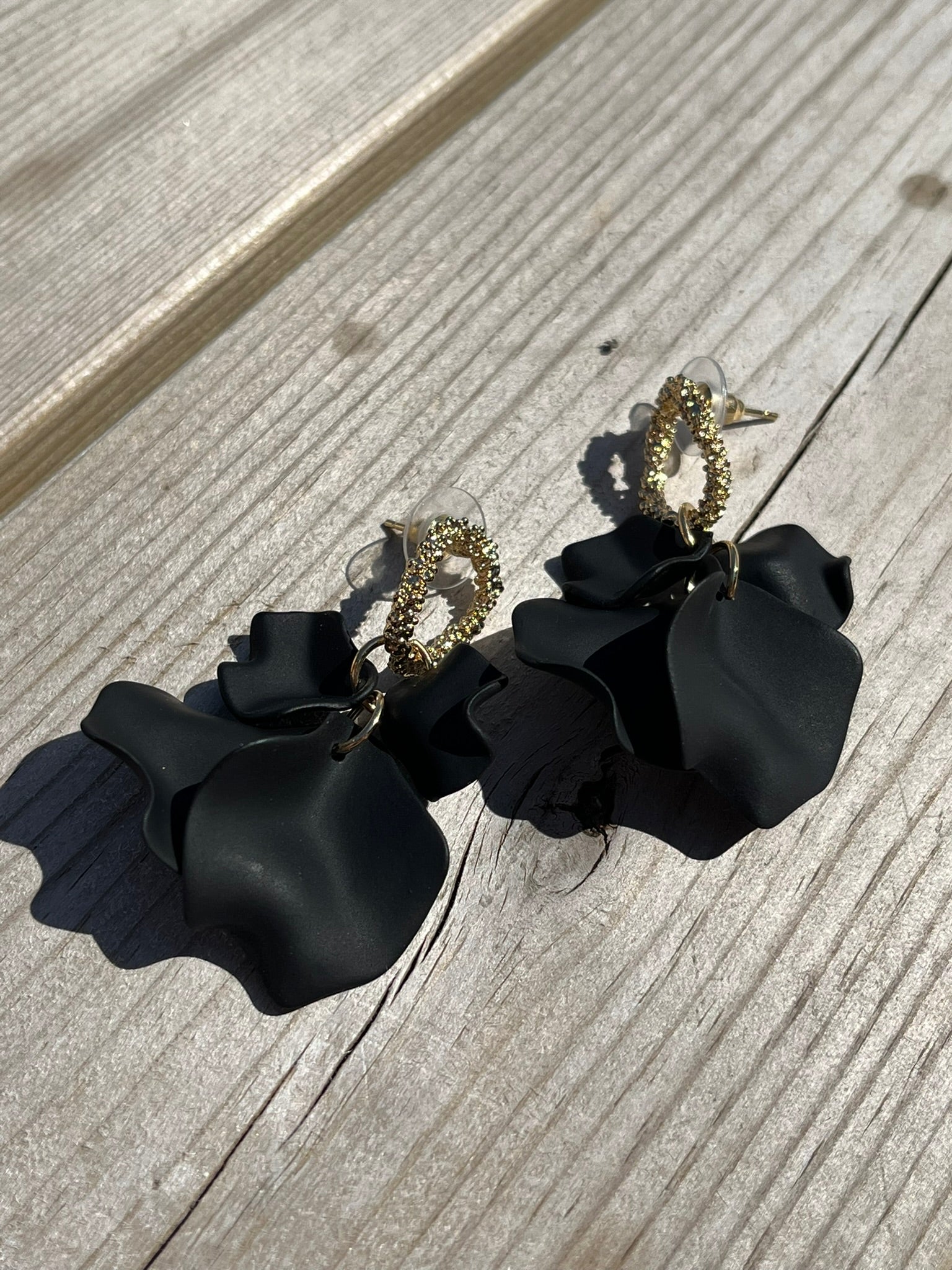 Midnight Bloom är för dig som vågar stå ut. Dessa dramatiska örhängen kombinerar svarta, böljande blomblad med en gnistrande guldfattning – en perfekt balans mellan mystik och glamour. Oavsett om du bär dem till vardags eller fest sätter de en elegant edge på hela din look.